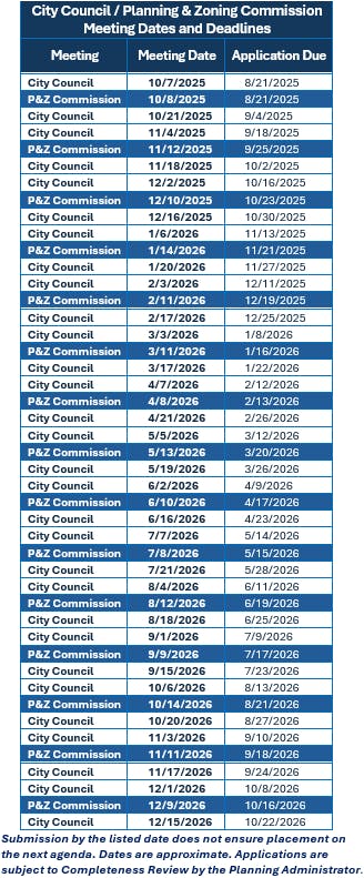 Application Due Dates for Public Meetings: Recommended application submittal dates, coinciding with Planning & Zoning Commission and City Council meetings, appear below. Submission by the recommended deadline does not guarantee placement on the next meeting agenda, as all applications are subject to a Completeness Determination by the Planning & Zoning Administrator per Section 14.3 of the Driggs Land Development Code. The listed dates are provided as a general guide.
