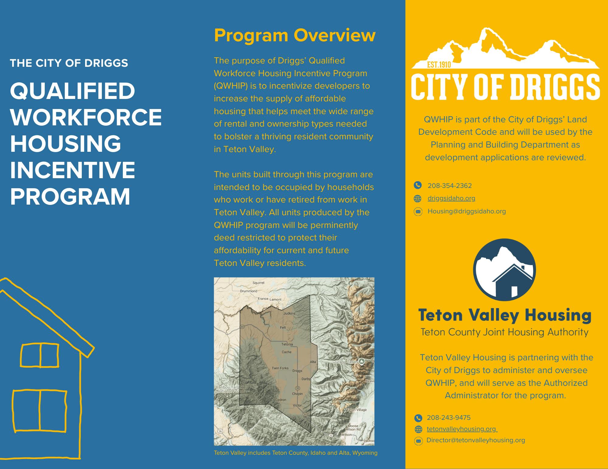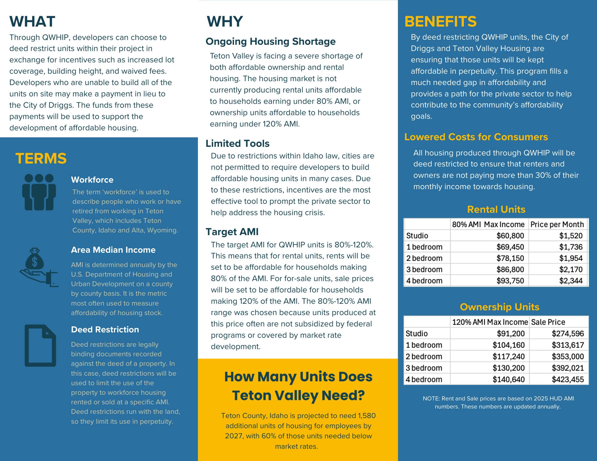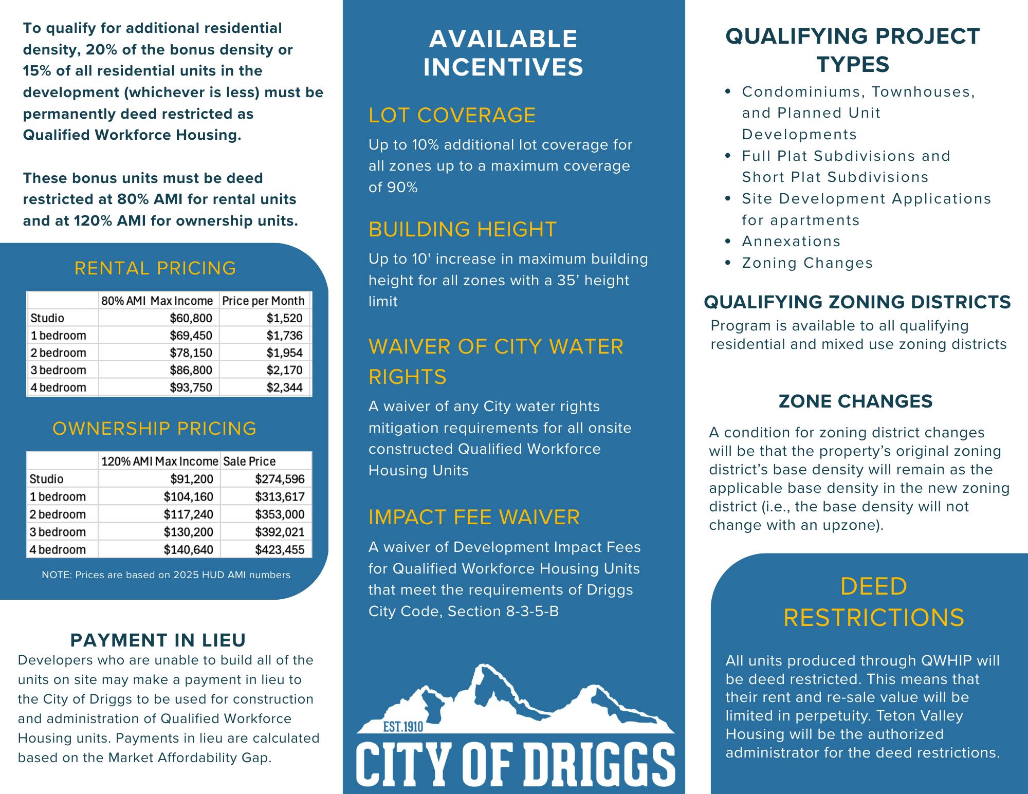The Qualified Workforce Housing Incentive Program (QWHIP) is the City of Driggs’ tool to encourage the creation of deed-restricted workforce housing within the city limits. The program allows developers to build workforce housing units in exchange for development incentives such as increased density, lot coverage, building height, and certain fee or mitigation waivers.