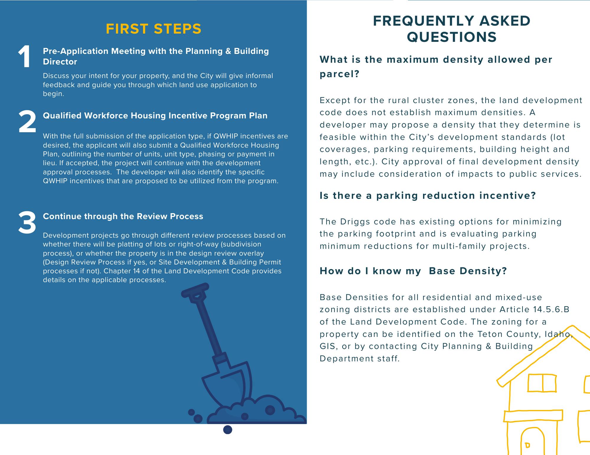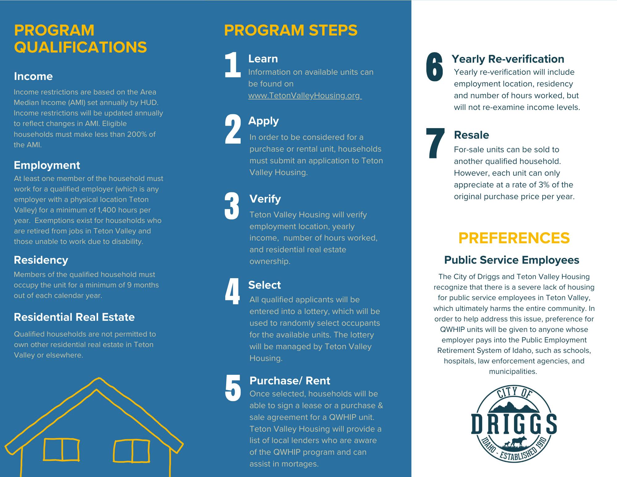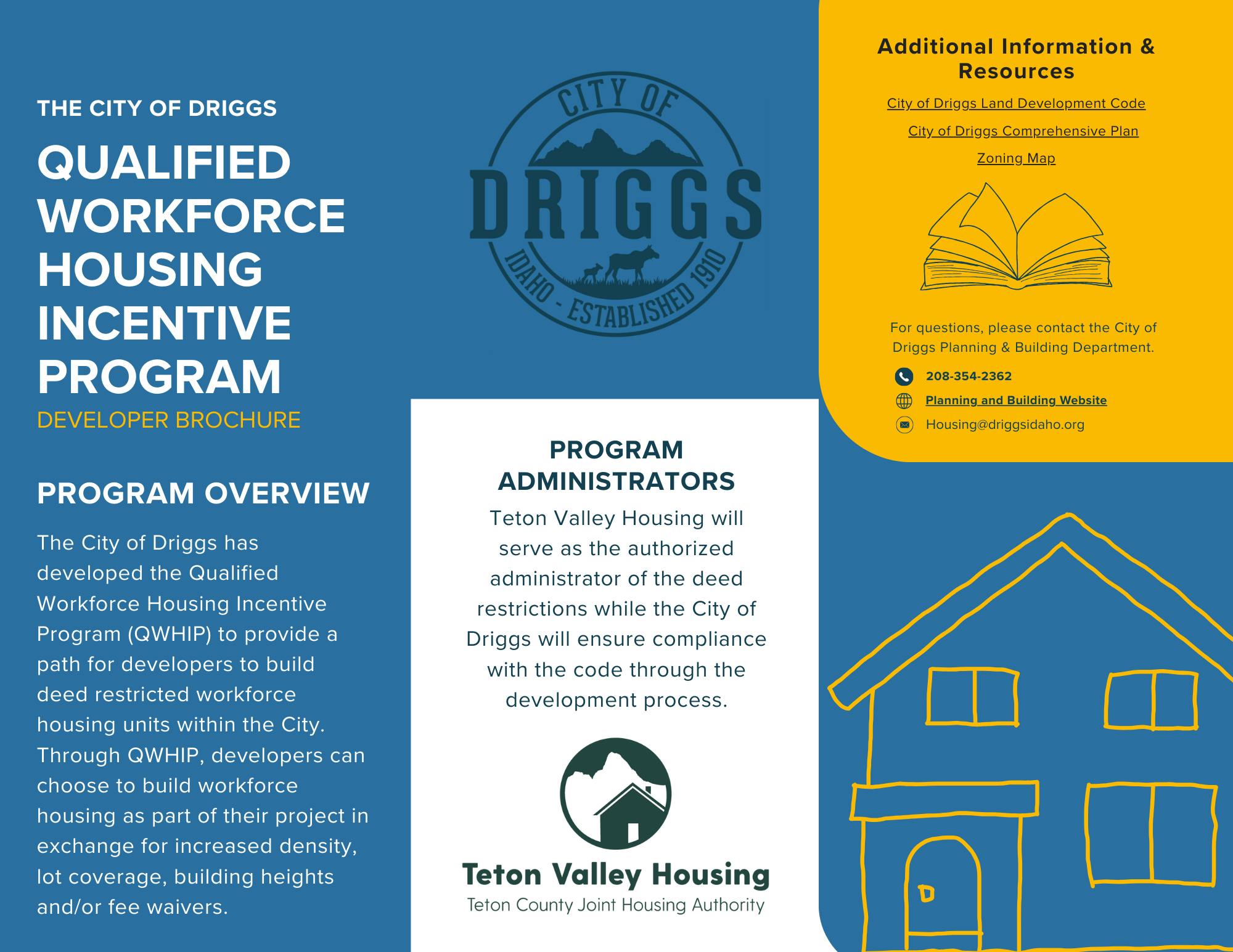 The Qualified Workforce Housing Incentive Program (QWHIP) is the City of Driggs’ tool to encourage the creation of deed-restricted workforce housing within the city limits. The program allows developers to build workforce housing units in exchange for development incentives such as increased density, lot coverage, building height, and certain fee or mitigation waivers.