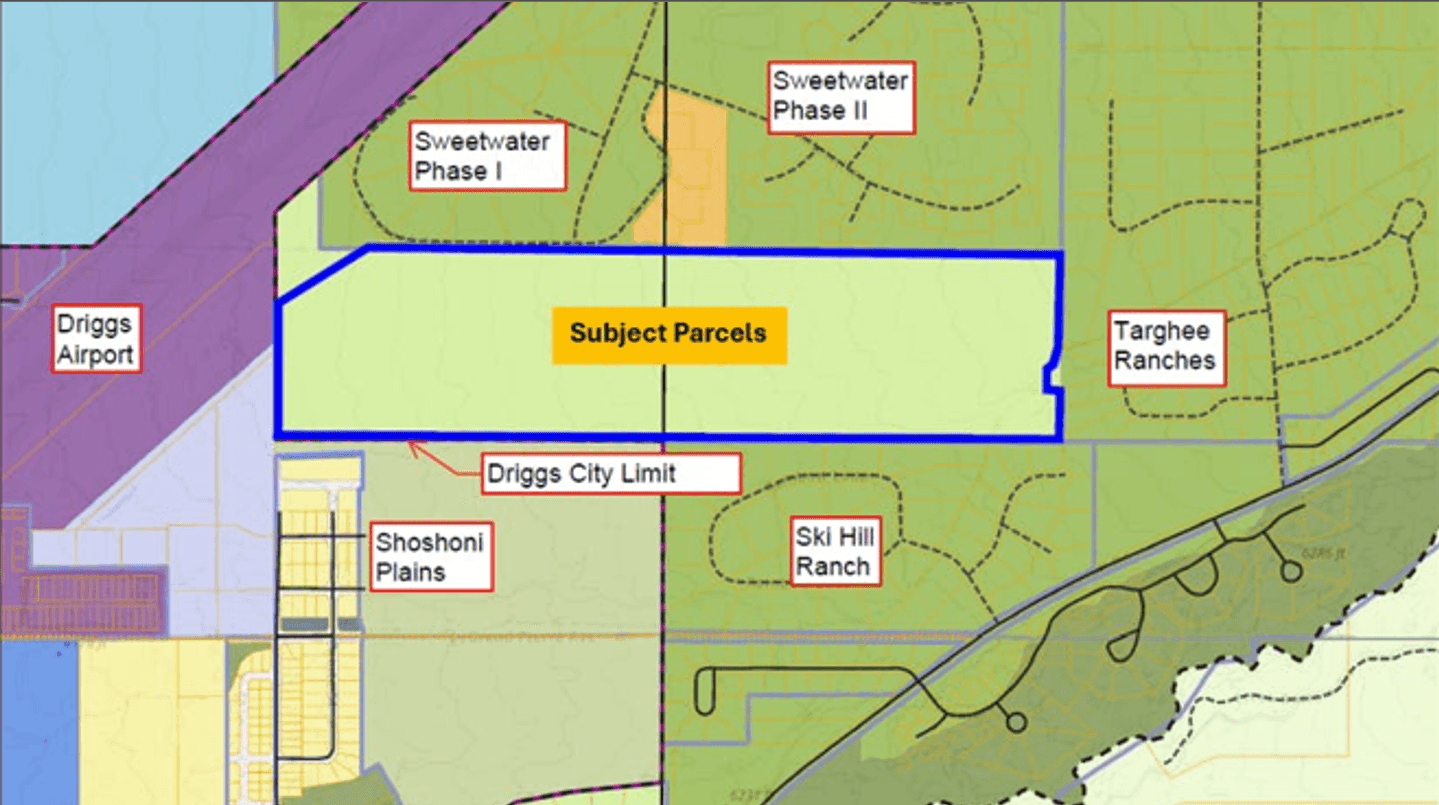 PROJECT SUMMARY: Live Oak Springs, LLC, represented by Sunrise Engineering, is requesting annexation of 154.62 acres into the City of Driggs with RC-1.0 Residential Cluster zoning. The property is located north of Shoshoni Plains and southeast of the Driggs Airport, within the City’s Area of Impact. The narrative submitted with the application describes potential future development of 184 residential units including 30 attached residential units on approximately 0.2-acre lots and 154 detached residential units on lots ranging from .25-acres to 1.0-acres, construction of streets, connections to City water and sewer, sidewalks, a pathway between Booshway St. and Teton Vista Dr., and approximately 5.15 acres of open space. Approval of the annexation and zoning would not approve a final development plan.