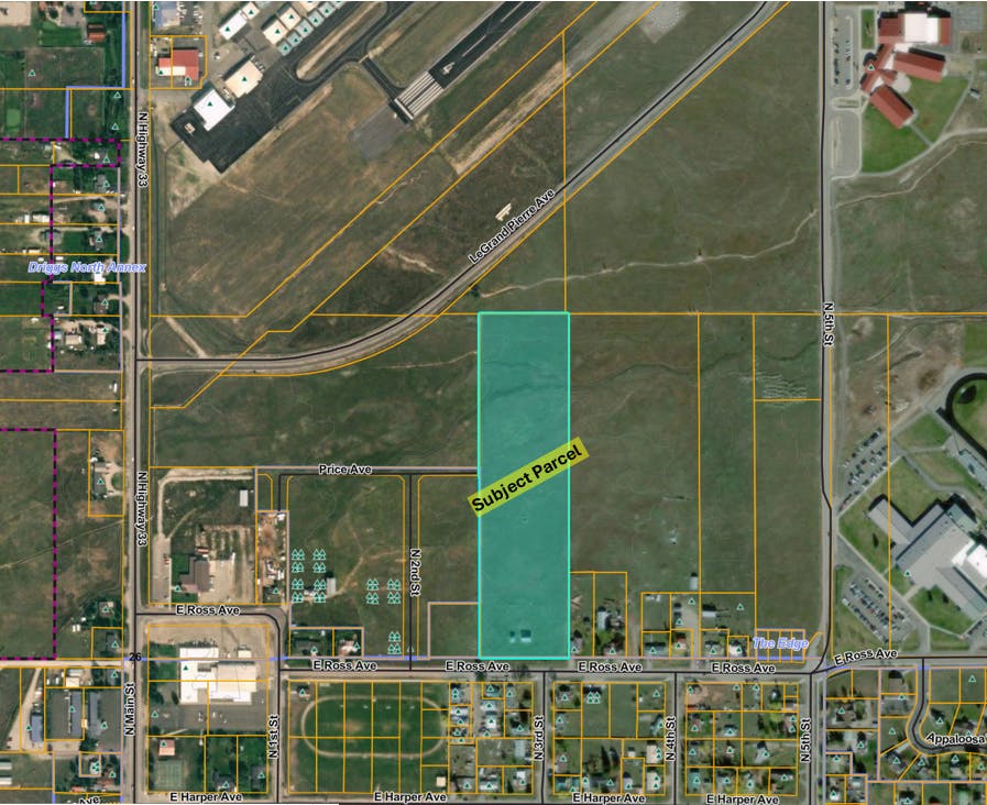 SUMMARY: An application has been submitted by Connect Engineering, on behalf of the owner LLKM Properties, for the rezone of a 10-acre lot (parcel RPA00000261850) located on E. Ross Ave. The applications proposes to rezone from RS-7: Single & Two Family and and IX: Industrial Flex to NX: Neighborhood Mixed Use and RM-2: Residential Multi-Family in order to increase density options including attached and multi-family residential units and neighborhood scale commercial uses. The parcel falls within the following overlays: Big Game Migration and Seasonal Range, Airport Traffic Pattern Area, Airport Airspace Protection Overlay, Airport Inner Critical Zone.